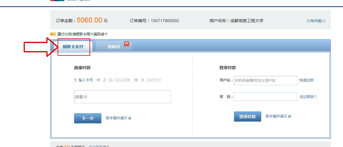 进入支付界面后,选择“银联卡支付”,然后根据提示一步一步操作即可。